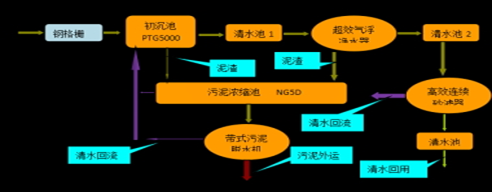 钢格栅间隙10mm,安装于原水进水渠内,使后序水泵的正常运转,原水首先进入初沉池,在这里调解水质并进行初步沉淀,降低水体负荷,清水溢流进入中间清水池1,沉淀的污泥由平流式抬耙式刮机刮集后由潜污泵打入污泥浓缩池,进入中间清水池的污水经由潜污泵提升进行超效气浮净水器去除水体中绝大部分胶体微细杂质,出水进入中间清水池2,同时收集的泥渣自流入污泥浓缩池。为使清水回用于生产采用高效连续砂滤器对水体进行进一步水质净化,确保达到好的回用效果。经污泥浓缩后的污泥由污泥泵打入带式污泥脱水机进行脱水处理,使得含水污泥体积减少明显,到原来的10%,在污泥的储运费用上节约明显,脱水后的污泥外运或回用。